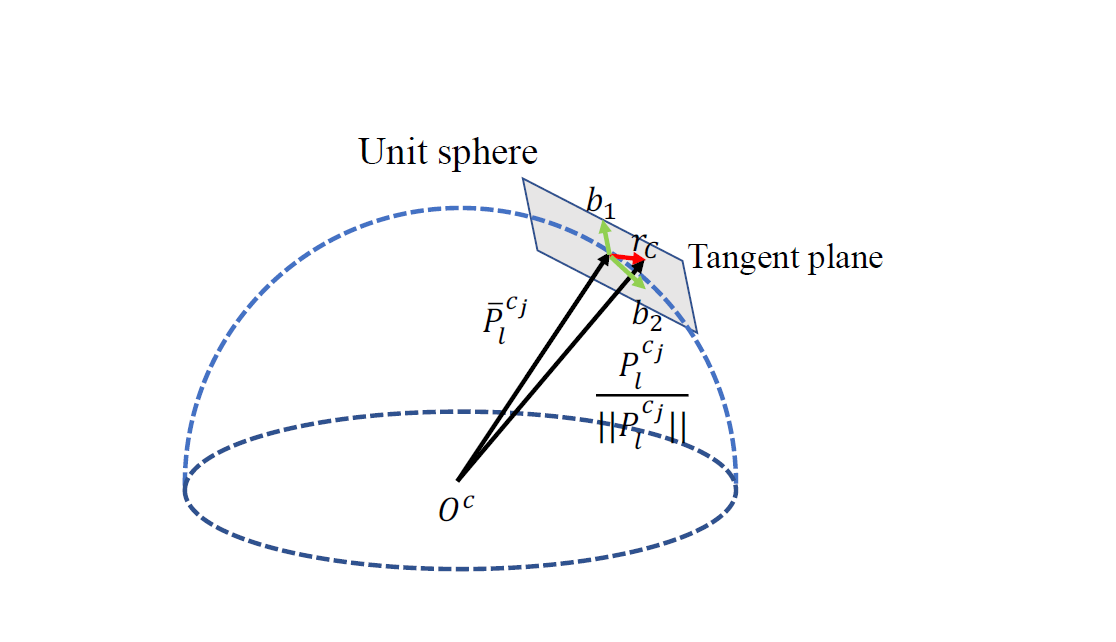 其中$\bar{g}^{c_0}$是$g^{c_0}$方向的单位矢量,$w_1,w_2$是待优化变量,$\vec{b}_1,\vec{b}_2$是切平面的基向量,如下选取: